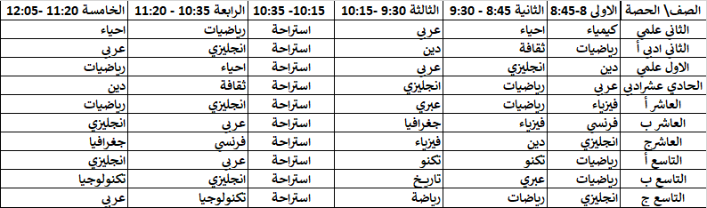 - تداوم المجموعة " الثانية" وجاهيا والمجموعة "الاولى" عن بعد لكل من الصف التاسع الاساسي جميع الشعب ، والصف العاشر الاساسي جميع الشعب ، والحادي عشر بفرعيه والثاني عشر بفرعيه غدا الثلاثاء 08-09 - 2020 م حسب البرنامج التالي: