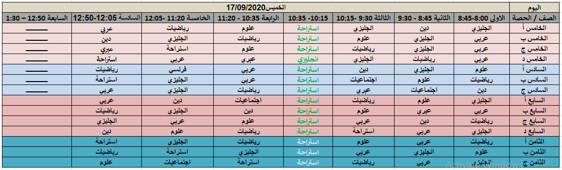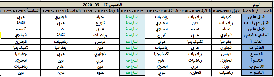 برنامج الدوام ليوم الخميس 17-09-2020 م :