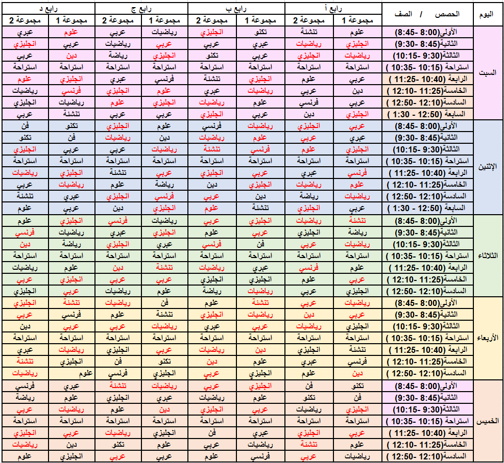 ملاحظة حصص الفن والرياضة والتكنولوجيا هي حصص استراحة للطالب في مرحلة الاغلاق